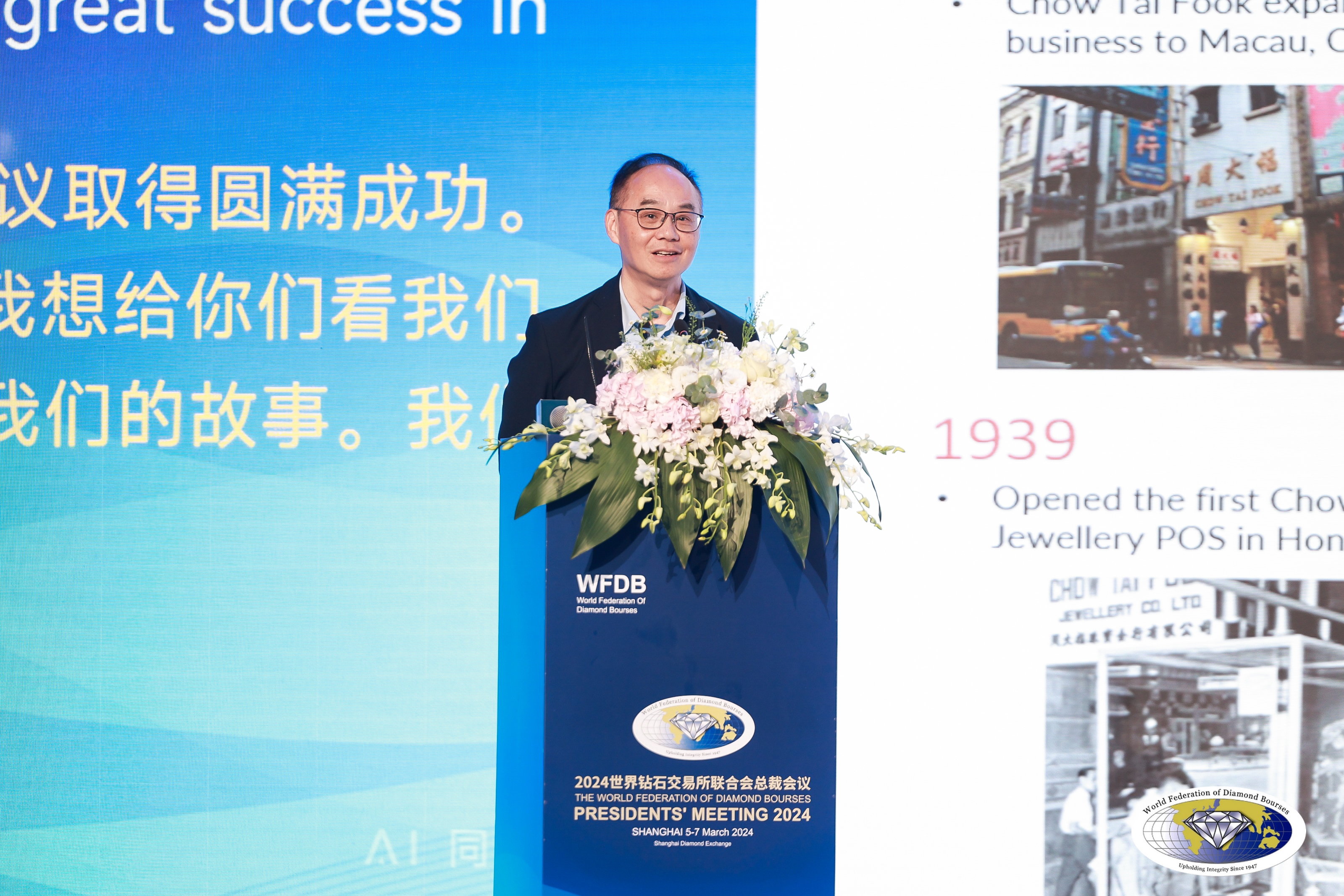 2024年3月6日,周大福珠宝集团董事总经理黄绍基先生于上海举行的2024世界钻石交易所联合会总裁会议开幕礼上致辞。今年的会议于3月5日至7日举行,出席者于为期三天的会议中,透过参与专家论坛、演讲及讨论环节,深入探讨全球钻石产业相关的重要议题。